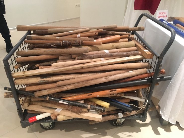 Sergilenenler arasında bulunan motorlu testere, samuray kılıcı, kartvizit ve kalem görünümlü bıçaklar, elektroşok cihazları da dikkat çekiyor. Sopaların üzerinde yazan, "eğitim şart" ve "haydar dömen" yazıları ise görenleri şaşırtıyor.