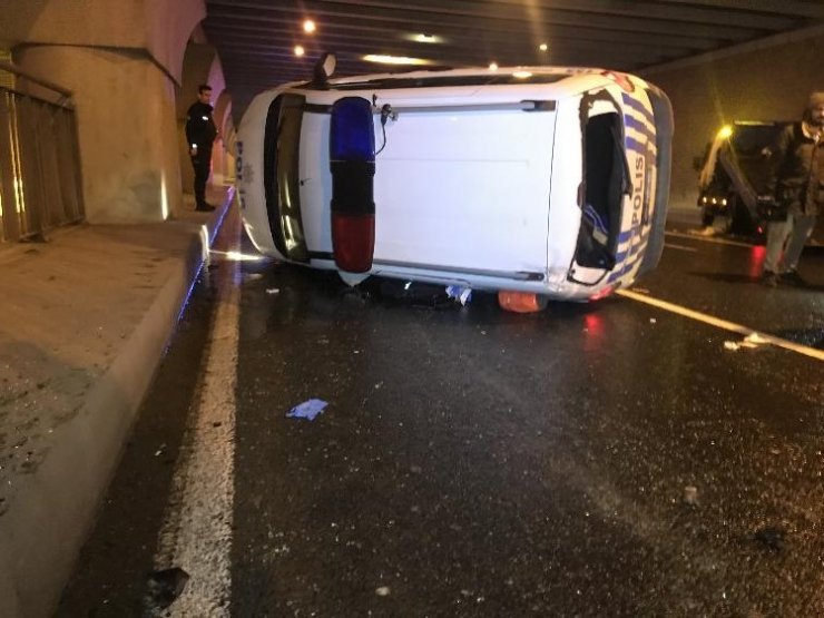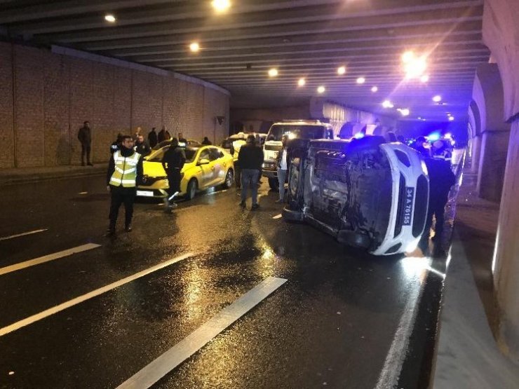 Gaziosmanpaşa'da polis ekiplerinin "Dur" ihtarına uymayan ticari taksi sürücüsü aracıyla birlikte kaçmaya başladı. Aracı takip eden polis aracı, Topkapı alt geçidinde otomobili kovaladığı esnada kaza yaparak devrildi. Kazada 2 polis hafif şekilde yaralanırken, olayla ilgili 1 kişi gözaltına alındı.