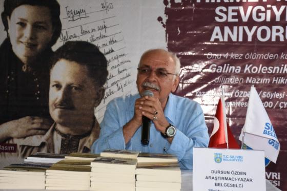 Silivri Belediyesi Nâzım Hikmet’in 54’üncü ölüm yıl dönümü olan 3 Haziran’da, Gazeteci- Yazar Dursun Özden ile “Galina’nın Nazım’ı” isimli bir söyleşi gerçekleştirdi. Çağdaş Yaşamı Destekleme Derneği Çay Bahçesi’nde düzenlenen söyleşide Nazım ile ilgili kaleme aldığı kitabından satırbaşları aktaran Özden, Nazım’ı, aşklarını, şiirlerini ve hayatını anlattı. Nazım Hikmet’in doktoru olan Galina ile tanıştığını, Nazım’a olan aşkını dinlediğini söyleyen Özden; “Galina ile 2015 yılında tanıştım. Bana tüm arşivlerini açtı, Nazım’ın fotoğraflarını, kitaplarını çıkarttı. Tüm anılarından bir belgesel oluşturmak için çalışmalara başladım. O’nu gözyaşlarıyla anlattı, mezarına hiç gitmediğini Nazım’ın onun için hala yaşadığını söyledi” dedi. Nazım Hikmet’i Türkçe’nin, Türk dilinin ödülsüz savunucu olarak nitelendiren Yazar Dursun, şunları söyledi; “Nazım Hikmet’in şiir yazma tekniklerini de dinledim Galina’dan. Şiir yazarken sessizliği sever, mutfakta çatal ve kaşık sesleriyle dizelerine ritim tutturuyormuş. Şiirlerinde o incelik ve iç sesler ilginçtir. En ilginç yanı da hasrettir. Ülkeden kaçışı, cezaevi yaşamı ve ölene kadar yaşamındaki hasret, şiirlerine yansımıştır. Nazım, hasret şairidir.” Söyleşi sonunda Silivri Belediyesi CHP Meclis Üyesi Süheyl Kırkıcı, Özden’e çiçek takdim etti. Gazeteci- Yazar Dursun Özden, kitaplarını Silivrililer için imzaladı.