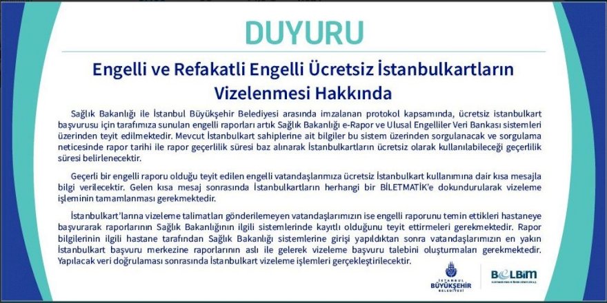 Sağlık Bakanlığı ile İstanbul Büyükşehir Belediyesi arasında imzalanan protokol nedeniyle, “Engelli” ve “Refakatli Engelli” İstanbulkart’larının vizeleme işleminden önce Sağlık Bakanlığı sistemine kaydettirilmesi g