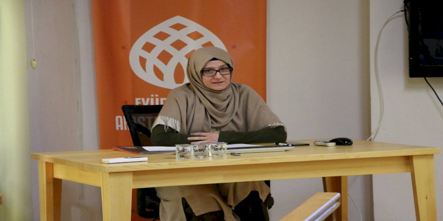 EYSAM Seminer Salonu’nda düzenlenen etkinlikte Hatice Arslan Sözüdoğru, Eyüp Sultan Türbesi (A) Haziresinde bulunan Meşahir-i Rical Müverrih ve Müderrisler konusunda yapılan çalışmaları anlattı.