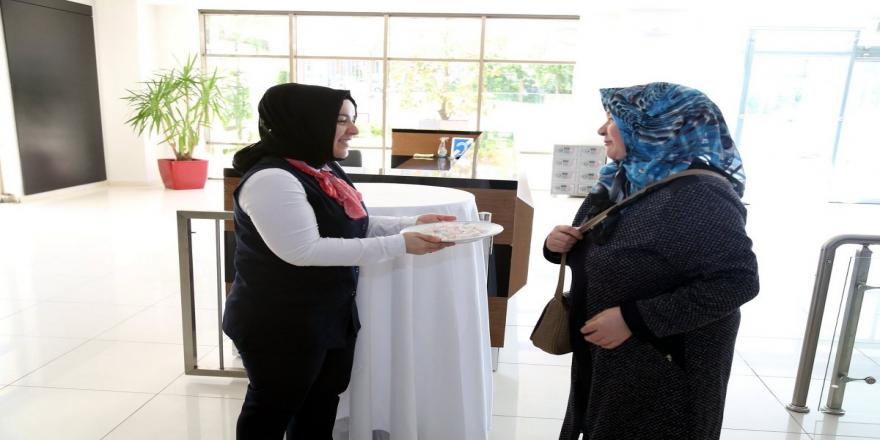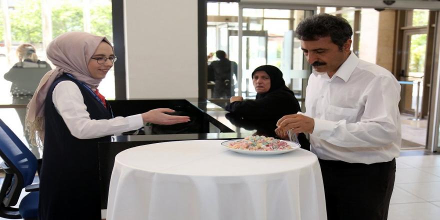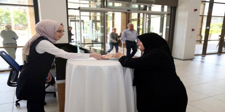Karşılama ile görevli personel gelen vatandaşlara işlem yaptıracağı birime yönlendirme konusunda yardımcı oluyor ve lokum ikramında da bulunuyor.