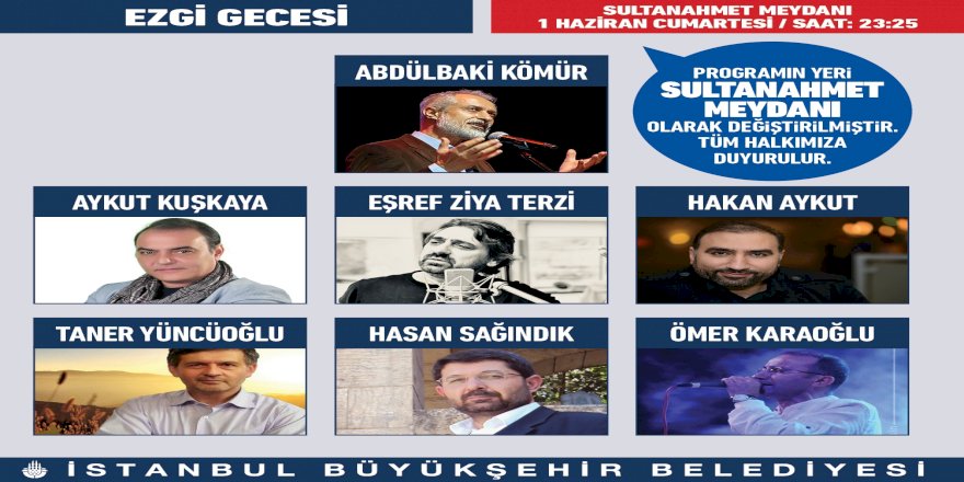 İstanbul Büyükşehir Belediyesi tarafından Ramazan etkinlikleri kapsamında 1 Haziran Cumartesi günü Yenikapı Ramazan Etkinlik Alanı’nda düzenlenmesi planlanan Ezgi Gecesi programımız, Yenikapı’da Diyanet