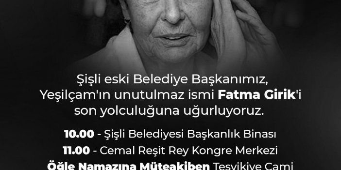 Öte yandan, unutulmaz sanatçı Fatma Girik'in cenaze programı da belli oldu. Şişli Belediye Başkanı Muammer Keskin, sosyal medya hesabından yaptığı paylaşımda, "Eski Şişli Belediye Başkanımız, Yeşilçam’ın unutulmaz ismi Fatma Girik’imizi 25 Ocak Salı günü (yarın) son yolculuğuna uğurluyoruz" dedi.