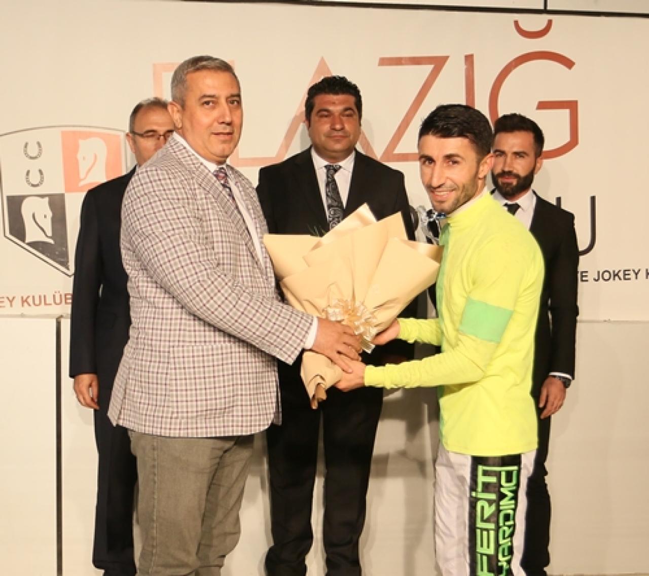 Fırat Üniversitesi Hastanesi Başhekimi Prof. Dr. İrfan Kaygusuz ise safkanın jokeyi Ferit Yardımcı’ya çiçek takdim etti.
