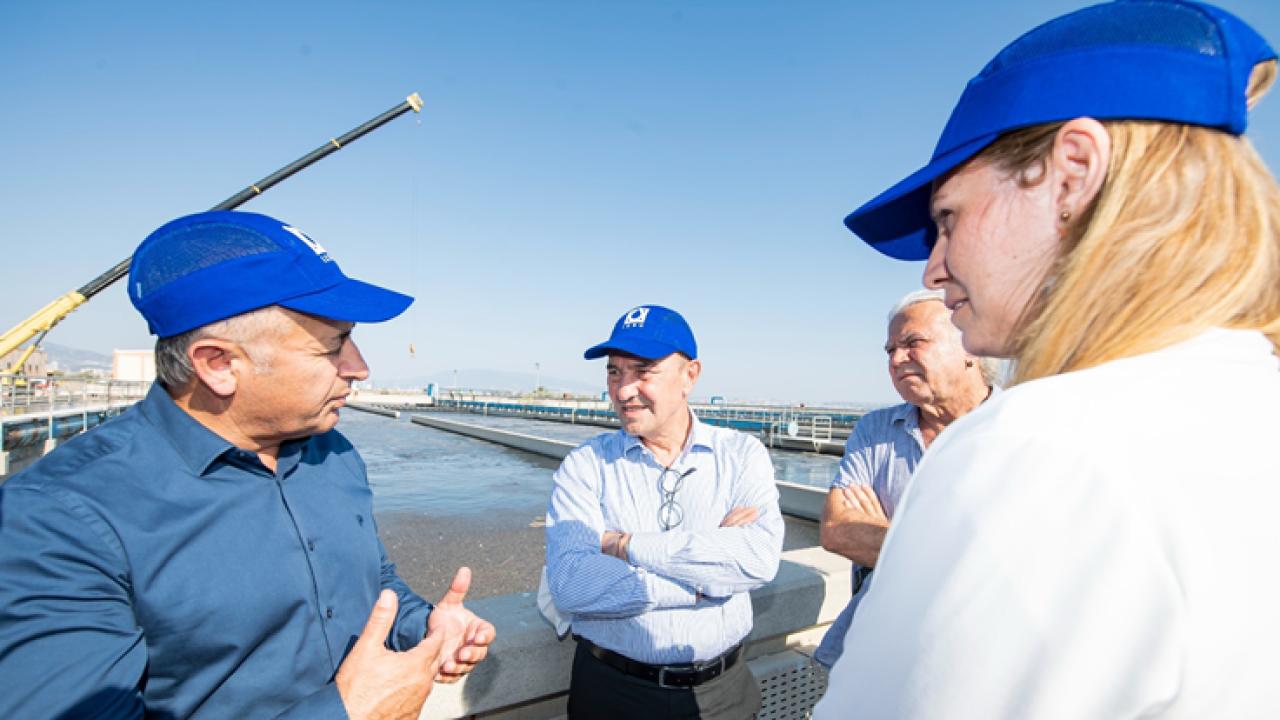 Tesisin arıtma kalitesini ve kapasitesini artıracak çalışmaları inceleyen Başkan Soyer, İZSU Genel Müdürü Ali Hıdır Köseoğlu ve İZSU bürokratlarından bilgi aldı.