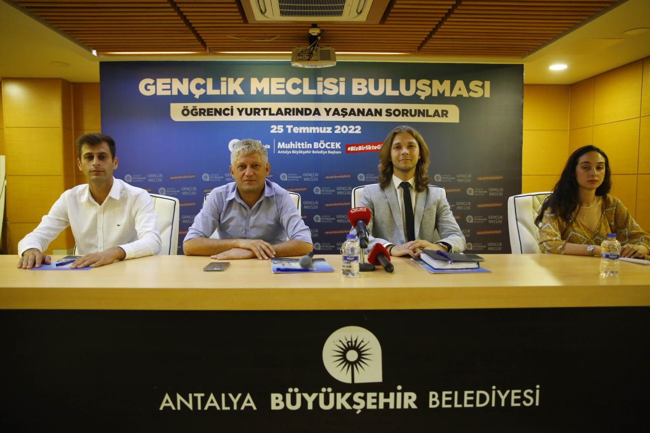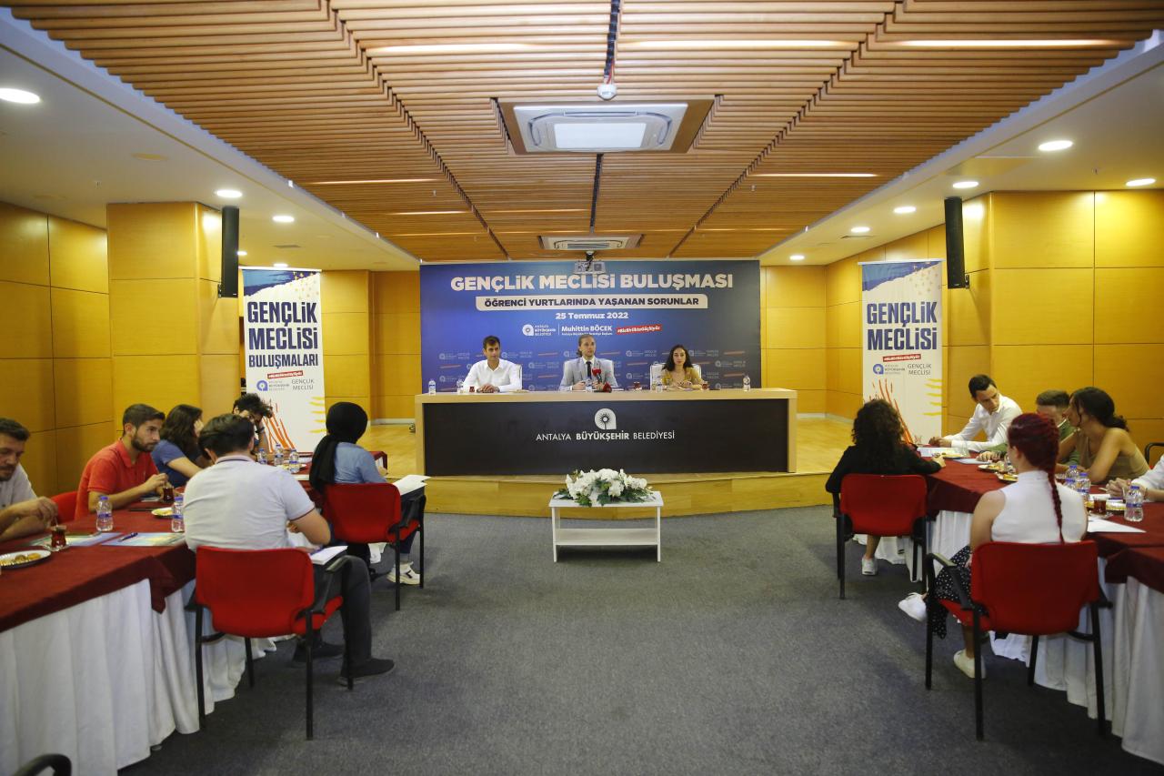 Antalya Büyükşehir Belediyesi Gençlik Meclisi, öğrenci yurtlarında yaşanan sıkıntıları ele almak için toplandı. Toplantıya Büyükşehir Belediyesi Genel Sekreter Yardımcısı Durmuş Ali Arslan, Gençlik Meclisi Üyeleri, siyasi partilerin gençlik kolları üyeleri katıldı.