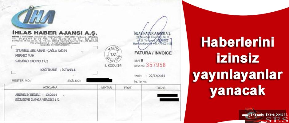 İstanbul Ses Gazetesi'nin İhlas haber ajansına her ay ödediği, Aralık Faturası.