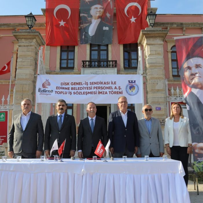Edirne Belediyesi Personel A.Ş. İle Disk Genel İş Sendikası ile Temmuz 2022 tarihinden geçerli olacak toplu iş sözleşmesi Belediye önünde düzenlenen törenle imzalandı. Edirne Belediyesi’nde çalışan işçiler, zamlı maaşlarını davulla zurnayla kutladı.