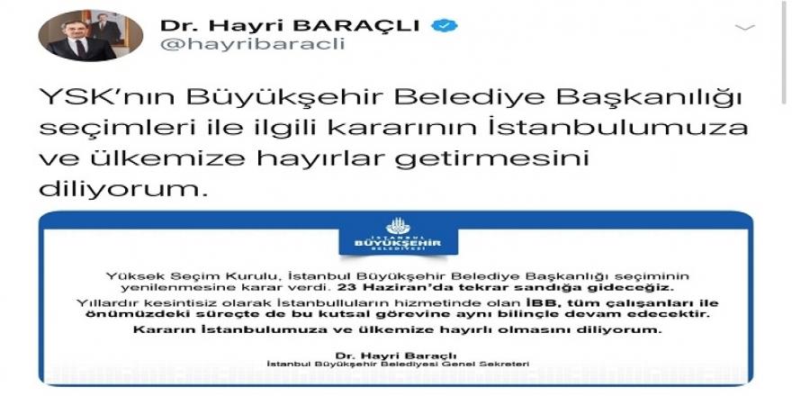 İstanbul Büyükşehir Belediyesi Genel Sekreteri Dr. Hayri Baraçlı, Yüksek Seçim Kurulu’nun (YSK) İstanbul Büyükşehir Belediyesi seçimlerinin yenilenmesine yönelik kararıyla ilgili sosya