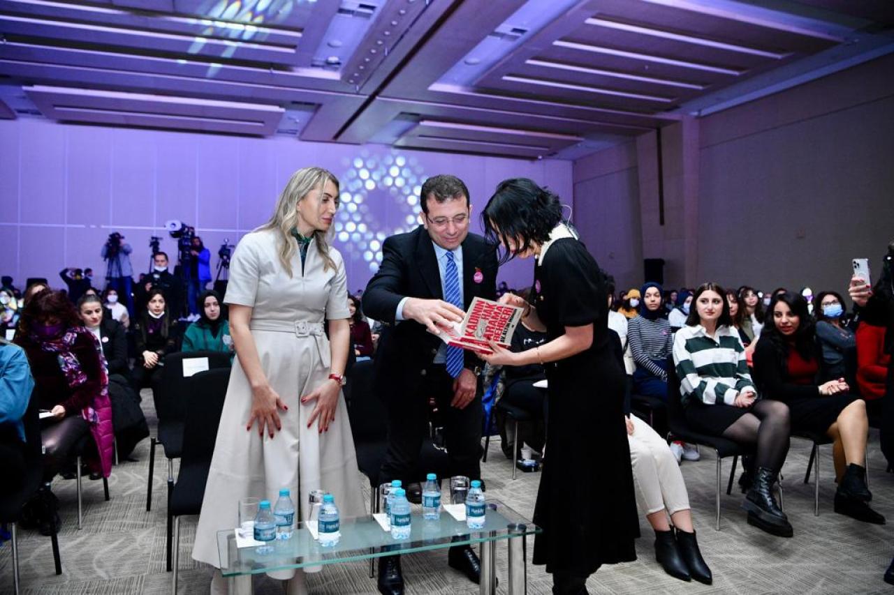 “Belediyemiz tarihinde, ilk kez öğrenci yurdumuz oldu ve burada önceliği kız öğrencilerimize tanıdık. Şu anda 625 kız öğrenciye ev sahipliği yapmanın da mutluluğunu yaşıyoruz” diyen İmamoğlu, hedeflerini, “5000 öğrenciyi ağırlayacak yurt kapasitesine sahip bir belediye olmak istiyoruz” sözleriyle özetledi. Tarih boyunca kadın hareketine yön veren bütün kıymetli isimleri minnetle andığını belirten İmamoğlu, “Dünyaya öncü olma konusunda, Türkiye'mizin o ilk yıllarında, Cumhuriyet’imizin o ilk yıllarında cesaretle kadının hem toplumdaki yerine hem seçme seçilme hakkından davranışlarıyla ve kadına gösterdiği büyük ilgiyle ve onlara verdiği cesaretle, hepimiz Gazi Mustafa Kemal Atatürk'e ne kadar minnet duysak azdır diye düşünüyorum” şeklinde konuştu. Her kız çocuğunun eşit olarak dünyaya geldiğini kaydeden İmamoğlu, “Kız-erkek ayırt etmeksizin, eşit doğan bütün çocuklarımızı, aynı zamanda bütün kızlarımızın da eşit haklarla beraber bu ülkede eğitim almalarını sağlamak, hepimizin boynunun borcudur. Bu mücadeleyi en sonsuz bir biçimde vereceğimize, hepinizin huzurunda söz veriyorum. Asla bundan vazgeçmeyeceğiz. Bu konuda kendi yaşamımda da bu tür süreçlerin örneği olan ve büyük katkılarla bu mücadeleye katılan kıymetli eşime, Dilek’e de yürekten teşekkür ediyorum. Ona da başarılar diliyorum. Dünya Emekçi Kadınlar Günümüz kutlu olsun” ifadelerini kullandı.