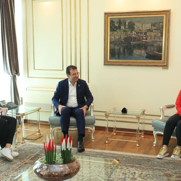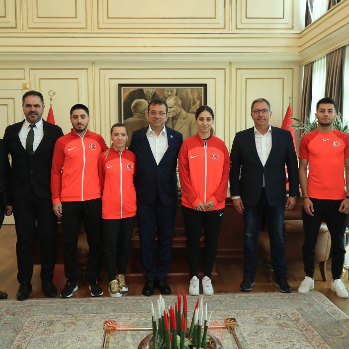 İstanbul Büyükşehir Belediye (İBB) Başkanı Ekrem İmamoğlu, Gaziantep’in Şahinbey ilçesinde 25-29 Mayıs 2022 tarihleri arasında arasında düzenlenen 57’nci Avrupa Karate Şampiyonası’nda 4 altın madalya kazanan İBB Spor Kulübü’nün (İBBSK) şampiyon sporcularını ağırladı. İmamoğlu’nun Saraçhane ana yerleşkesindeki makam odasında gerçekleştirilen buluşmaya; şampiyon sporcular Serap Özçelik Arapoğlu, Eda Eltemur, Erman Eltemur ve Burak Uygur katıldı. İBBSK Başkanı Fatih Keleş, Genel Sekreter Erdem Aslanoğlu ve Karate A Takım Koordinatörü Yaser Şahintekin de şampiyon sporculara eşlik etti.