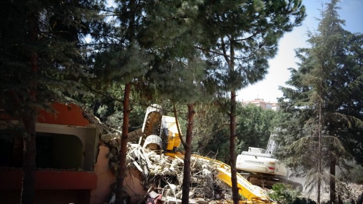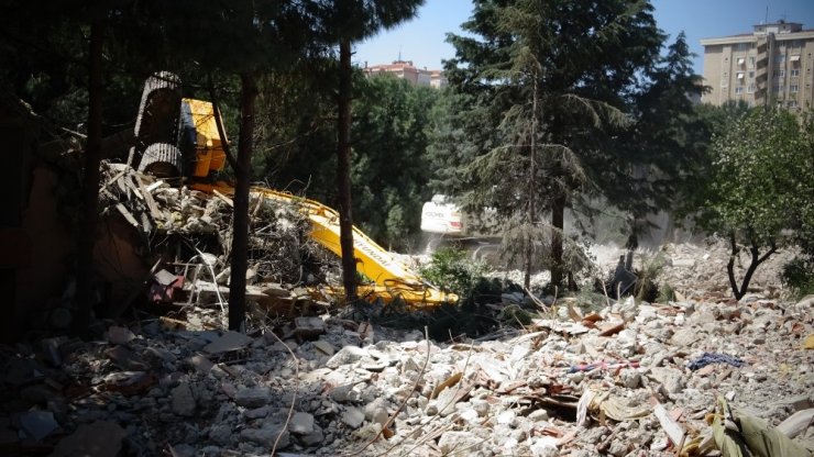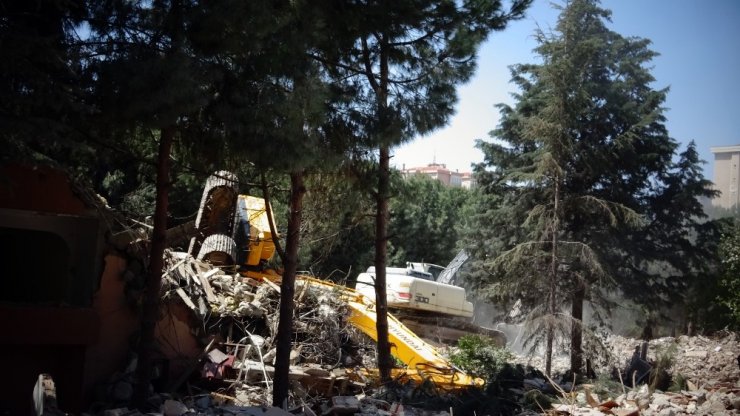 Maltepe'de binanın yıkım çalışmaları sırasında iş makinesi binanın üst katlarından zemine düştü.