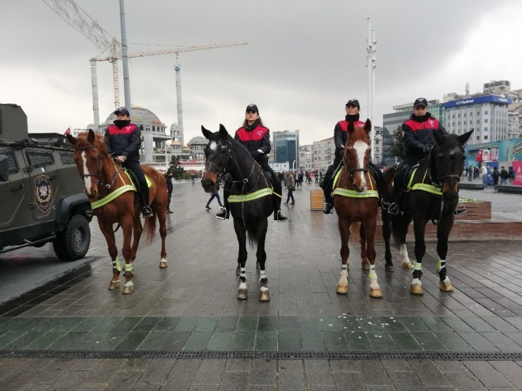 İstanbul Emniyet Müdürlüğü, yılbaşı gecesi için alınan tedbirleri Taksim'de basın mensuplarına tanıttı. Yılbaşı gecesi görev yapacak atlı timler, milli piyango satıcısı, çöpçü ve simitçi kılığındaki güven timleri ve polis köpekleri de tanıtım toplantısına katıldı.