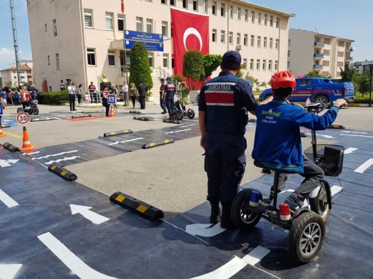 Öğrenciler, komutanlığın bahçesine kurulan uygulamalı trafik parkurunda anlatılan konulara ilişkin uygulama yaptı. Jandarma yeleği giyen öğrenciler, trafikçi, sürücü, yaya ve gözlemci olarak görev alırken, komutanlık bünyesinde bulunan akülü bisikletleri de kullanma imkanı yakaladı.
