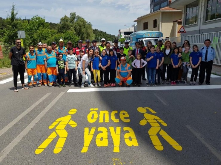 Komutanlık bahçesinde verilen eğitimin ardından Çekmeköy İlçesi Kışla Caddesi üzerinde bulunan İstanbul Fen Bilimleri Merkezi Okulu'na giden jandarma ekipleri, trafik polisleri ve öğrenciler, yaya geçidi çizgileri ile yerde yazan "Önce Yaya" yazısını boyadı.