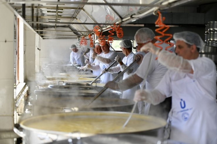 Üsküdar Belediyesi, Ramazan ayı vesilesiyle her gün 16 farklı noktada dağıtılması için dev kazanlarda 30 bin kişilik iftar yemeği hazırlıyor. Yemeklerin yapımı için 4 ton dana eti, 3 ton pirinç, 2 tona yakın mercimek, bir o kadar nohut, 3 ton tulumba tatlısı kullanılıyor. Üsküdar Belediyesi Aşevi'ni ziyaret edip aşçı önlüğünü giyen ve kazanların başına geçen Başkan Hülmi Türkmen, bütün İstanbulluları en az 1 gün Üsküdar'da iftar yapmaya davet etti.