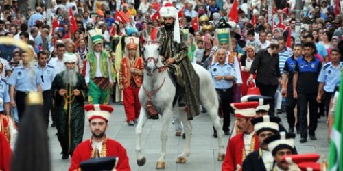 Fatih Sultan Mehmet’in hocası Akşemseddin’den haremdeki sultanlara ve cariyelere, yeniçerisinden şehzadesine kadar 100’ü aşkın Osmanlı saray kostümlü Gaziosmanpaşalı'nın fetih yürüyüşü, renkli görüntülere sahne oldu. Vatandaşlar, Osmanlı hanedanını canlandıran Gaziosmanpaşalılar ile hatıra fotoğrafı çektirirken, yürüyüş boyunca Mehter Takımı’nın seslendirdiği marşlara eşlik etti.