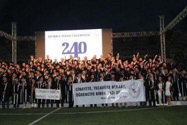 İTÜ’nün mezuniyet töreni dün Maslak Kampüsü’ndeki stadyumda gerçekleşti. Mezun öğrencilerin ve ailelerin katıldığı törene, birçok üniversitede olduğu gibi Gezi Parkı direnişi damgasını vurdu. Geçit törenine baret ve gaz maskeleriyle katılan mezunlar, “Şantiyelerimize ayakkabılarıyla girip bira içmişler”, “Sizin satırınız bizim kitaplarımız var”, “Gereksiz biber gazı kronik direniş yaratır”, “Senin sıktığın suyun basıncını biliriz biz” yazılı pankartlar taşıdı.