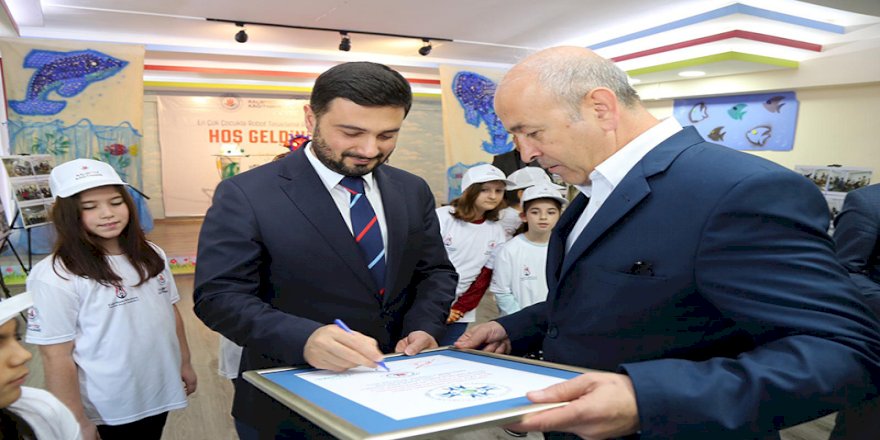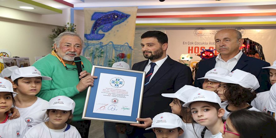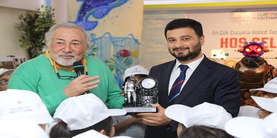 Robot tasarımını inceleyen Rekor Tescil Hakem Heyeti Başkanı Prof. Dr. Orhan Kural, “en çok çocukla robot yapma” rekor tescil belgesini Kağıthane Belediye Başkanı Mevlüt Öztekin’e takdim etti.