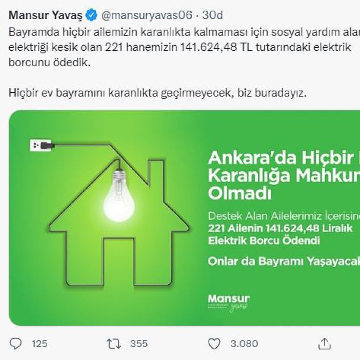 Ankara Büyükşehir Belediyesi, elektrikleri kesilen ya da kesileceği yönünde ihbarname alan 221 ailenin elektrik borçlarını ödedi. Büyükşehir Belediye Başkanı Mansur Yavaş sosyal medya hesapları üzerinden yaptığı paylaşımla, “Bayramda hiçbir ailemizin karanlıkta kalmaması için sosyal yardım alan ve elektriği kesik olan 221 hanemizin 141 bin 624 lira 48 kuruş TL tutarındaki elektrik borcunu ödedik. Hiçbir ev bayramını karanlıkta geçirmeyecek, biz buradayız” dedi.