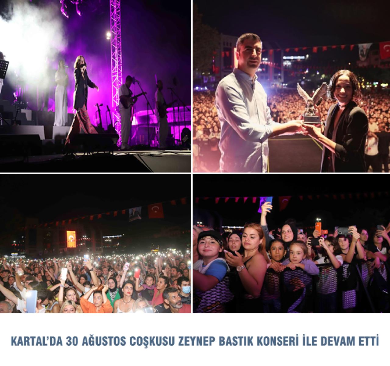 26 Ağustos 1922’de Ulu Önder Gazi Mustafa Kemal Atatürk’ün önderliğinde başlayan ve Kurtuluş Savaşı’nı zafere taşıyan Büyük Taarruz’un 100. yıl dönümü dolayısıyla Kartal Belediyesi tarafından düzenlenen kutlamalar kapsamında ünlü sanatçı Zeynep Bastık sahne aldı. Ünlü şarkıcı bayram coşkusunun yaşandığı gecede kendisini dinlemeye gelen hayranları ile unutulmaz bir konsere imza attı. Konserde Zeynep Bastık, sevilen pek çok şarkısını Kartallılar ile birlikte seslendirdi.