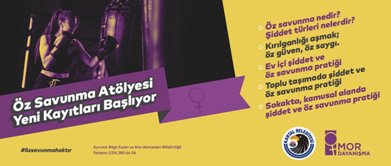 Kartal Belediyesi ve Mor Dayanışma işbirliğiyle başlatılan Öz Savunma Atölyesi çalışmalarına başvurular Kartal Belediyesi Kadın ve Aile Hizmetleri Müdürlüğü’ne yapılabilecek. Atölye çalışmaları kapsamında; Öz savunma nedir? Şiddet türleri nelerdir? Kırılganlığı aşmak; öz güven, öz saygı… Ev içi şiddet ve öz savunma pratiği. Toplu taşımada şiddet ve öz savunma pratiği. Sokakta, kamusal alanda şiddet ve öz savunma pratiği başlıklarını içeren eğitimler verilecek. Beş hafta sürecek eğitimlerde öz savunma stratejileri teorik ve pratik olarak öğretilecek. Eğitimlerin sonunda kadınlara katılım belgesi verilecek.