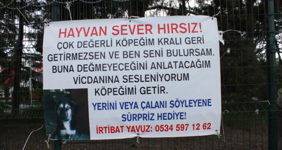 Sarıyer’de kaybolan köpeklerinin peşine düşen vatandaşlar sonunda çareyi hırsızın vicdanına seslenmekte buldu. Köpeğini arayan Yavuz isimli vatandaş ise ilçenin değişik yerlerine pankartlar asarak köpeğini geri istedi.
