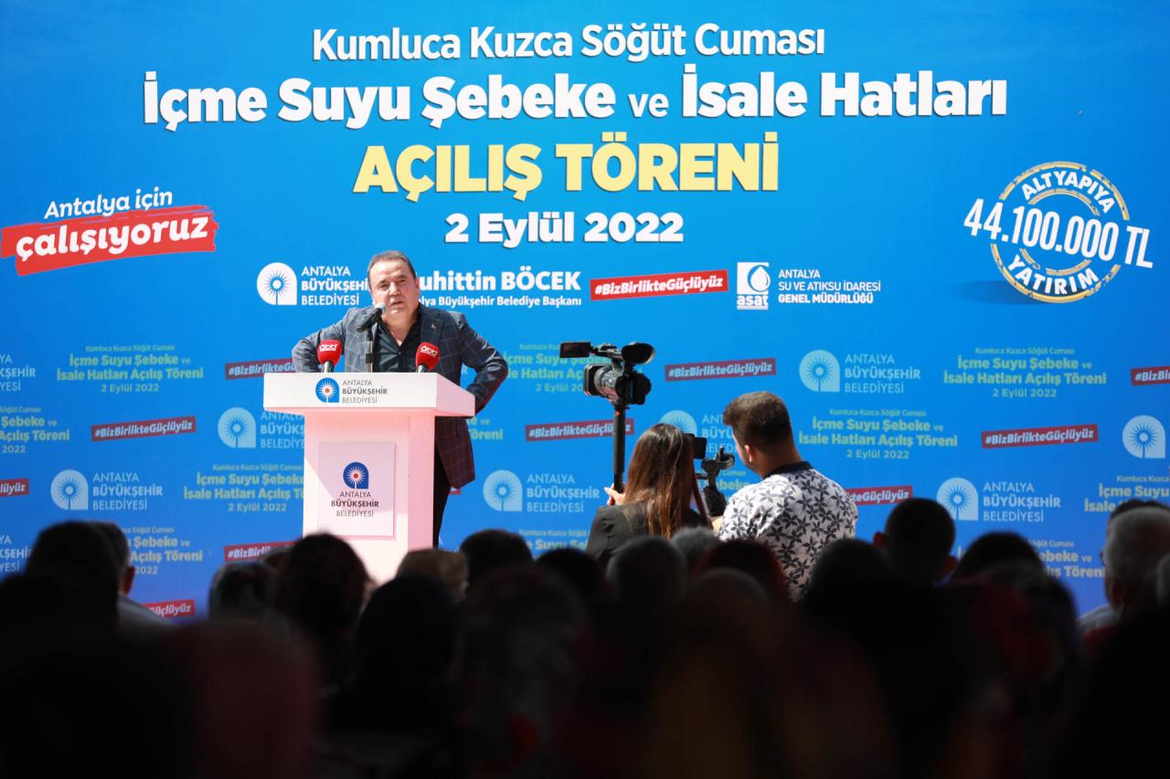 Antalya Büyükşehir Belediyesi ASAT Genel Müdürlüğü tarafından 44 milyon TL’lik yatırımla gerçekleştirilen Kumluca Kuzca Söğüt Cuması İçme suyu Şebeke ve İshale Hatları Projesi törenle hizmete açıldı. Torosların zirvesinde yer alan, Kumluca, Kemer, Konyaaltı Belediyeleri sınırları kesişimindeki Kuzca Söğüt Cuması bölgesinin yıllardır süregelen içme suyu sorununu çözüme kavuşturan projenin açılışına Antalya Büyükşehir Belediye Başkanı Muhittin Böcek, Antalya CHP Milletvekili Cavit Arı, Konyaaltı Belediye Başkanı Semih Esen, Kumluca Belediye Başkanı Mustafa Köleoğlu, Kemer Belediye Başkanı Necati Topaloğlu, muhtarlar ve çok sayıda vatandaş katıldı.