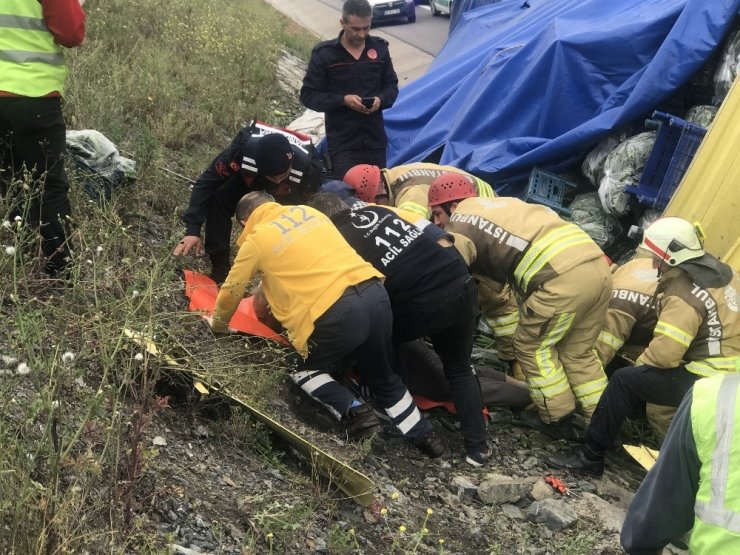 Kuzey Marmara Otoyolu Uskumruköy mevkisinde sürücüsünün direksiyon hakimiyetini kaybettiği kamyon yol kenarına devrildi. Araçta sıkışan sürücü itfaiye ekiplerinin dakikalar süren çalışması sonucu kurtarıldı. Sağlık ekipleri bilinci kapalı olan sürücüye uzun süre kalp masajı yaptı.