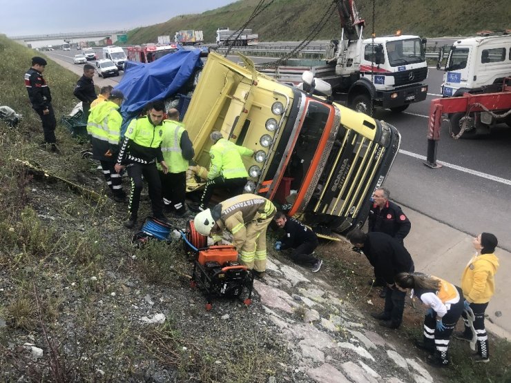 Kuzey Marmara Otoyolu’nda kamyon devrildi: 1 yaralı