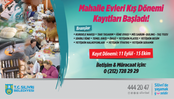 Kadınların el berecilerini geliştirerek aile bütçelerine katkı sağladığı Silivri Belediyesi Mahalle Evleri’nde kış dönemi kayıtları başladı. Yeni Mahalle, Alipaşa, Kavaklı, Değirmenköy, Ortaköy, Seymen, Selimpaşa, Gümüşyaka, Büyükçavuşlu, Semizkumlar ve Çanta Mahallesi’nde hizmet veren Mahalle Evlerinde kursların yanı sıra ilk yardım, yangın söndürme, insan hakları, psikolojik danışmanlık ve sağlık konularında eğitim çalışmaları yapılıyor.