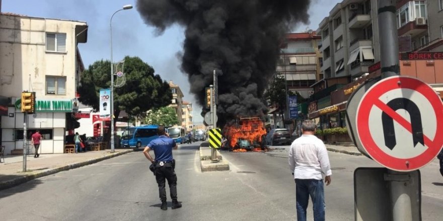 Maltepe'de yolcularını indirdikten sonra yol ortasına minibüsünü çeken bir sürücü, minibüsü benzin dökerek ateşe verdi. Alev alev yanan minibüs nedeniyle caddenin trafiği bir süre durdu.