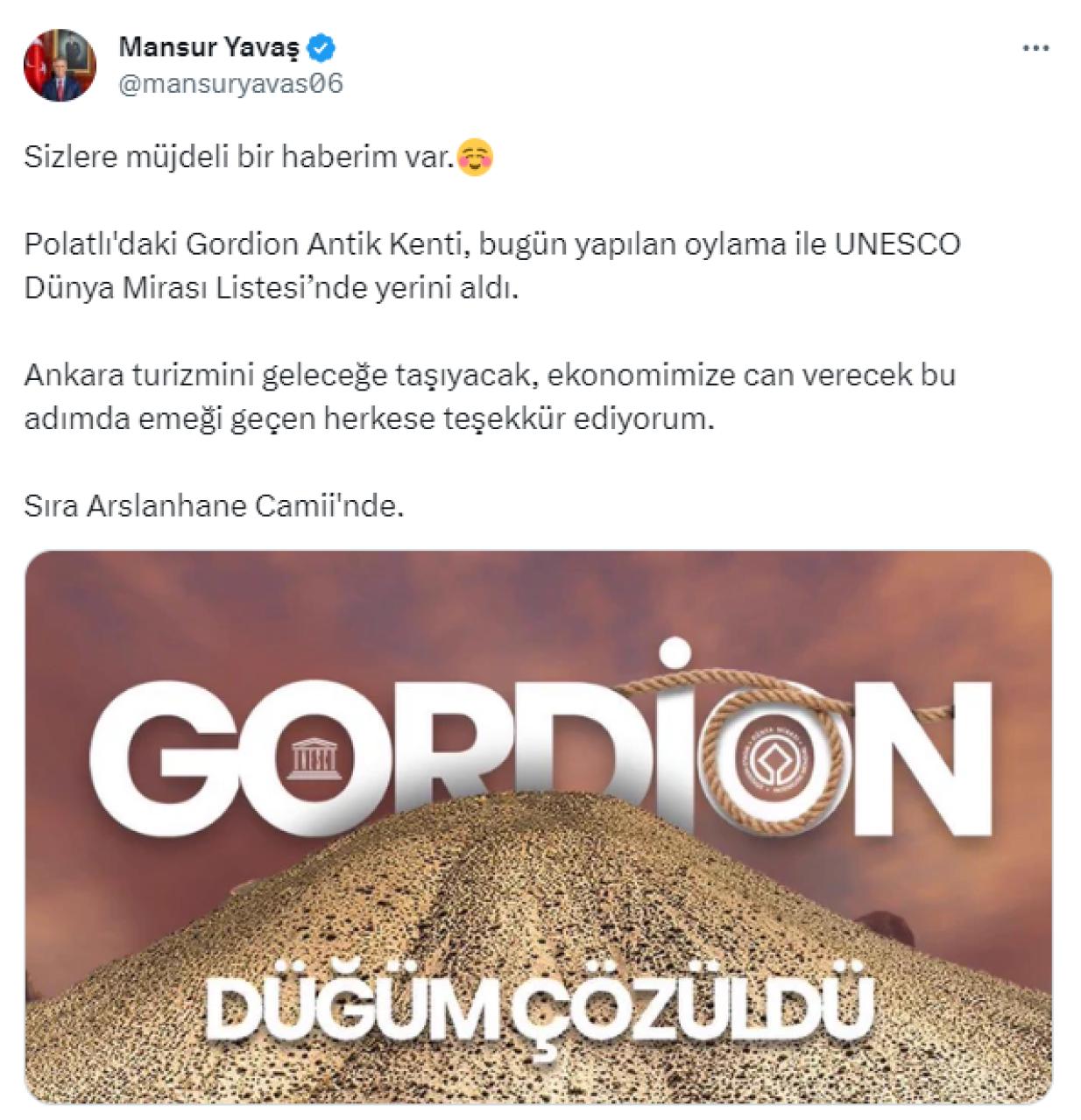 “Polatlı’daki Gordion Antik Kenti, bugün yapılan oylama ile UNESCO Dünya Mirası Listesi’nde yerini aldı. Ankara turizmini geleceğe taşıyacak, ekonomimize can verecek bu adımda emeği geçen herkese teşekkür ediyorum. Sıra Aslanhane Camii’nde…”