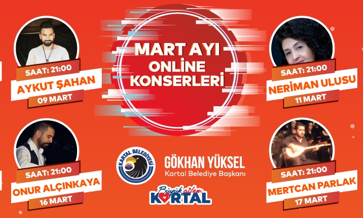 Kartal Belediyesi, pandemi sürecinden olumsuz etkilenen müzik sektörüne destek olmak ve Kartallı müzikseverlerin konser özlemini gidermek amacı ile Şubat ayında başlattığı destek konserlerine, Mart ayı süresince de devam ediyor. Kültür ve Sosyal İşler Müdürlüğü’nün organizasyonu ile gerçekleşecek olan online konserler serisi kapsamında 19 sanatçı sahne alacak.