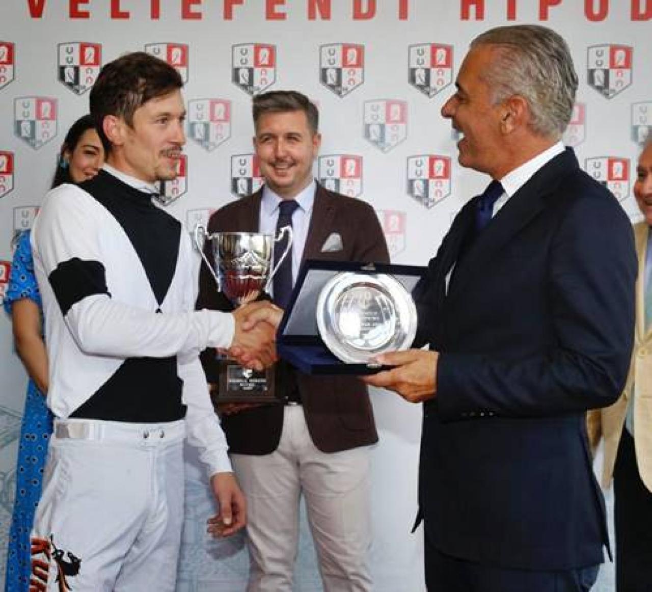 Yönetim Kurulu Üyemiz M. Kerem Alkan ayrıca kazanan safkanın jokeyi Ayhan Kurşun'a da plaketini verdi.