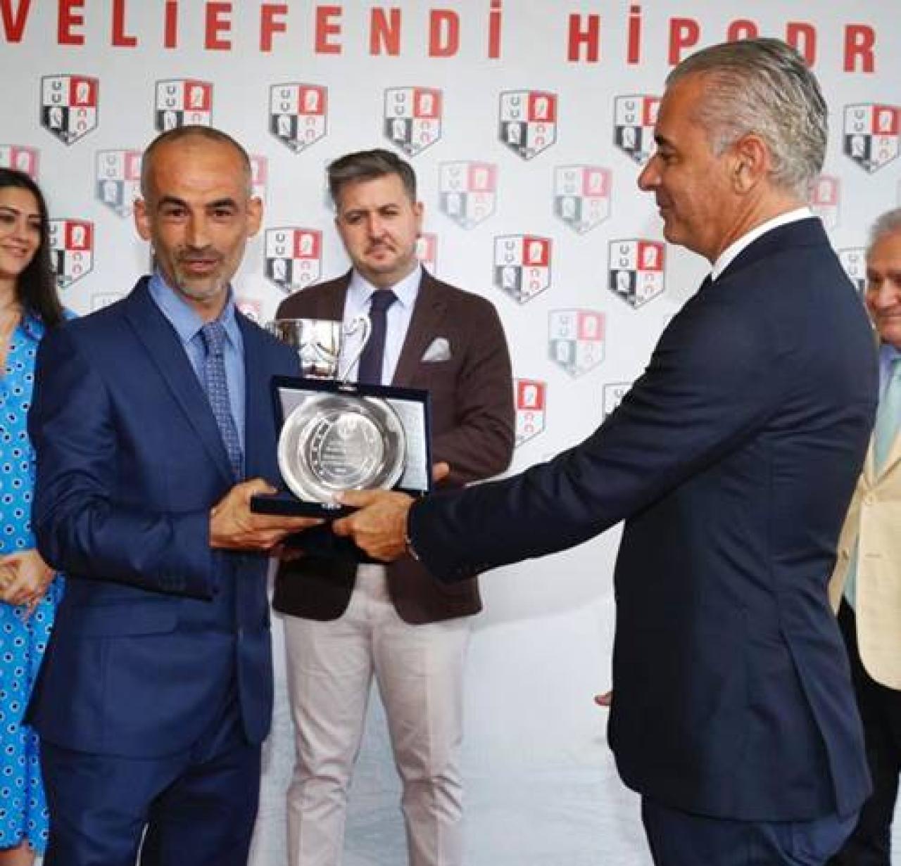 Yönetim Kurulu Üyemiz M. Kerem Alkan kazanan safkanın antrenörü Sabit Eren'e plaketini takdim etti.