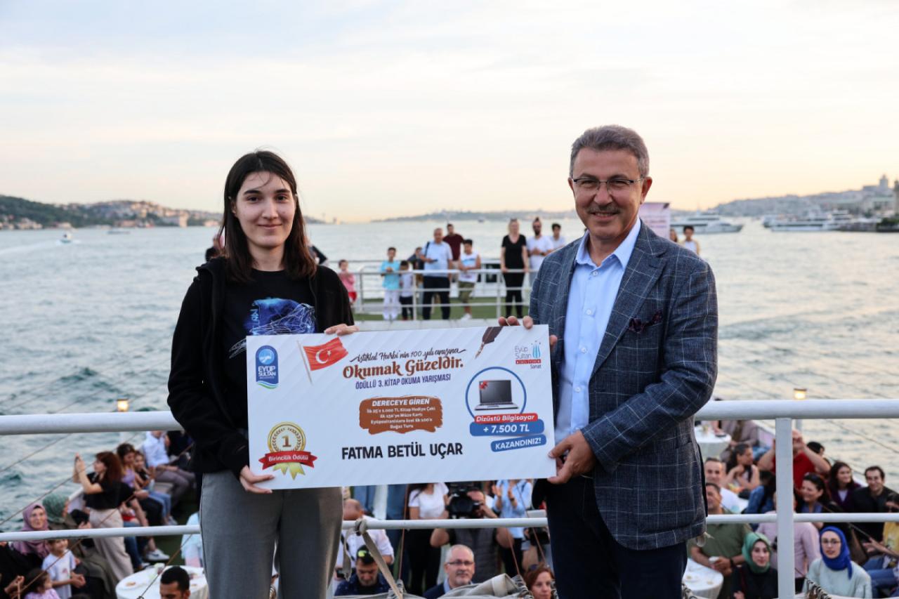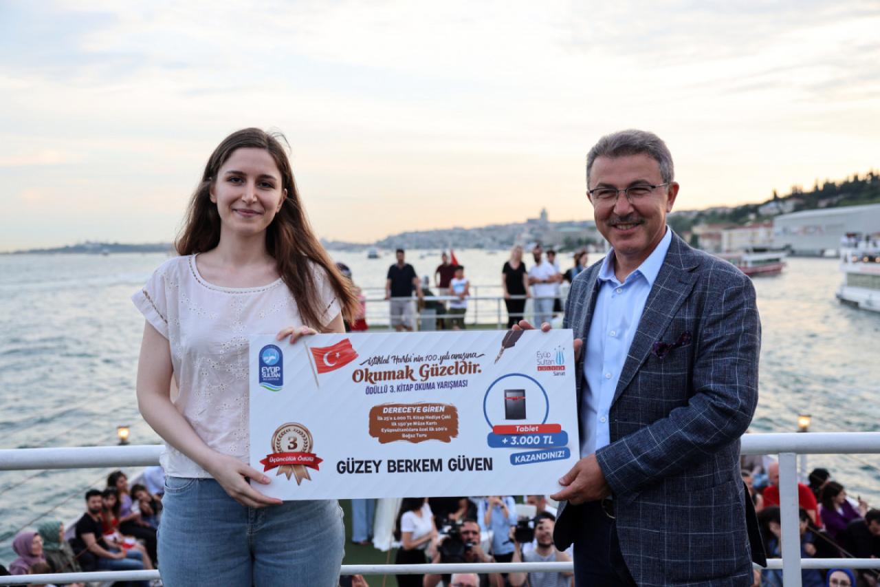 Yarışmada 1. olan Fatma Betül Uçar’a 7 bin 500 TL ve dizüstü bilgisayar, 2. olan Bahar Tuğrul’a 5 bin TL ve tablet, 3.olan Güzey Berkem Güven’e 3 bin TL ve tablet, Eyüpsultan birincisi olan Asiye Şefika Sümeyye Kapusuz Karakaya’ya ise fotoğraf makinesi hediye edildi. Yarışmada ayrıca dereceye giren ilk 25 kişi 1.000 TL kitap hediye çeki, dereceye giren ilk 100 Eyüpsultanlı yarışmacı çift kişilik boğaz turu, dereceye giren ilk 150 kitapsever ise Müze Kart verildi.