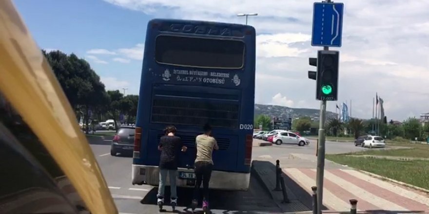 Kartal Sahilyolu'nda iki katlı otobüsün arkasına takılarak yolculuk yapan patenci gençler adeta ölüme davetiye çıkardı. Otobüs hareket ederken bir de akrobatik hareketler yapan gençler, yürekleri ağza getirirken, o anlar cep telefonu kameralarınca saniye saniye kaydedildi.