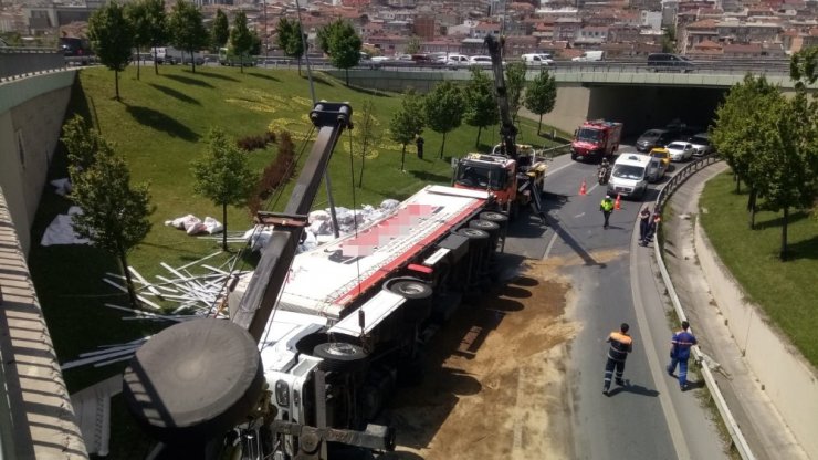 O-3 otogar Bağlantı yolu Aksaray yönünde sürücüsünün direksiyon hakimiyetini kaybettiği iplik dolu tır yola devrildi. Yakıt deposu delinen tırdan akan mazotu belediye ekipleri kumlarken yaralı sürücü ambulansla hastaneye kaldırıldı.