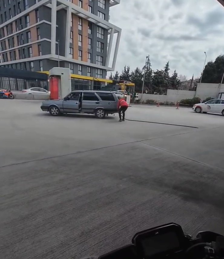 Olay, dün akşam saatlerinde Pendik Tavşantepe'deki bir akaryakıt istasyonunda meydana geldi. Yakıt almak için istasyona gelen sürücü, dolum işlemi tamamlandıktan sonra pompayı çıkarmayı unutarak hareket etti. Durumu fark eden istasyon çalışanının uyarısı üzerine sürücü aracını durdurdu. Kaza sonucu herhangi bir yaralanma ya da maddi hasar oluşmazken, olay anı istasyonda müşteri olarak bulunan bir motosikletlinin kask kamerasına yansıdı. Trajikomik kaza sonrası yaşanan diyaloglar yüzleri gülümsetti. Görüntülerde, sürücünün arkadaşının, "hortumu kopardı, benzinliği mahvetti" dediği, araç sürücüsünün de, "beni de atarsınız sosyal medyaya" dediği duyuldu.