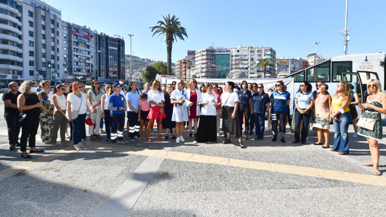 Basın açıklamasının ardından kadına yönelik şiddetin ve kadın cinayetlerinin son bulması için farkındalık turu atıldı. Kadınlar, “Bizim şehrimizde sadece rüzgar şiddetli eser” yazısıyla giydirdikleri üstü açık otobüsle Basmane’den çıktıkları turu, Konak, Fahrettin Altay, Alsancak ve Karşıyaka’dan geçerek tamamladı.