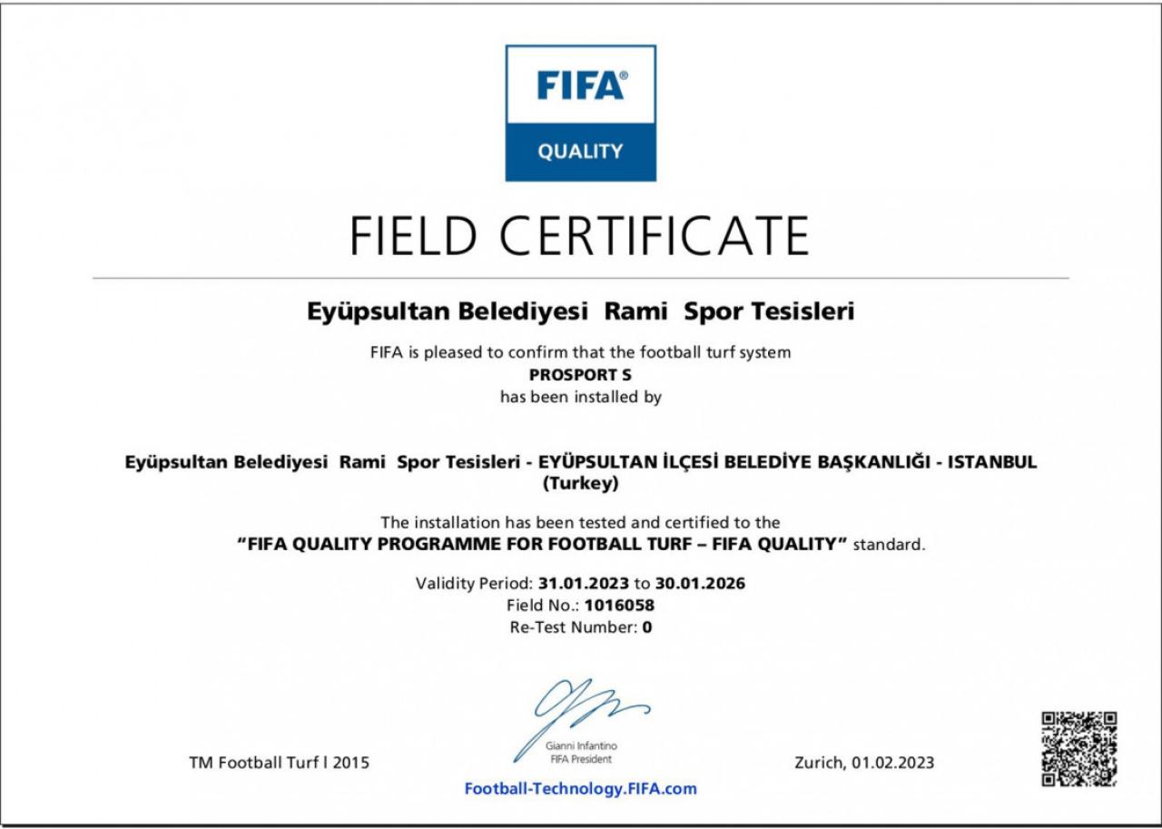 Başkan Deniz Köken’in ilçeye kazandırdığı önemli eserler arasında bulunan Eyüpsultan Belediyesi Rami Spor Tesislerine "FIFA Standardı Kalite Belgesi" verildi.