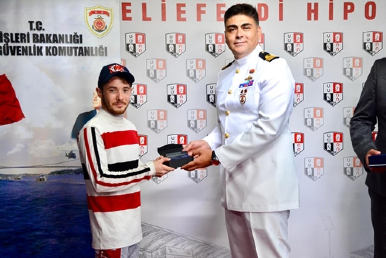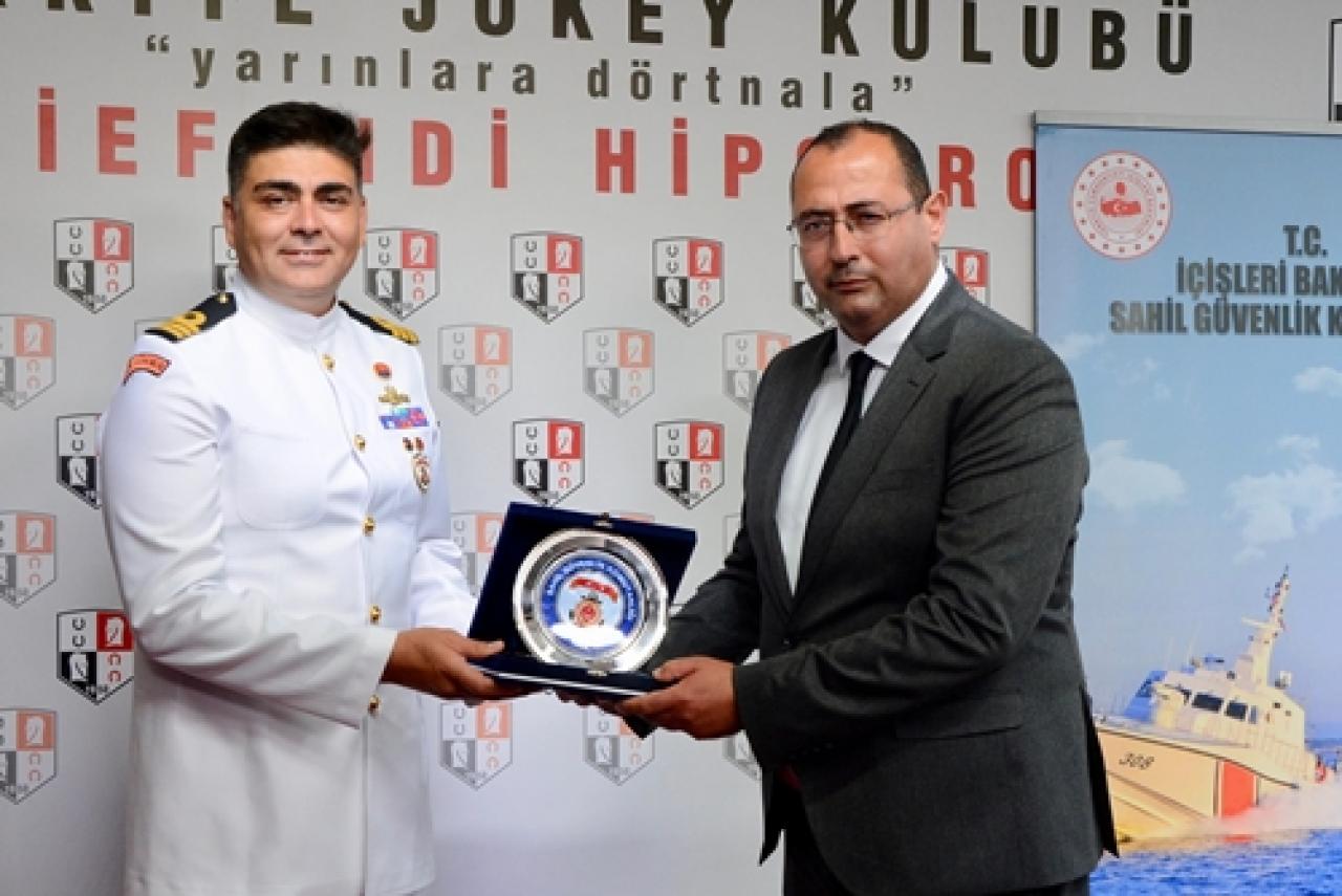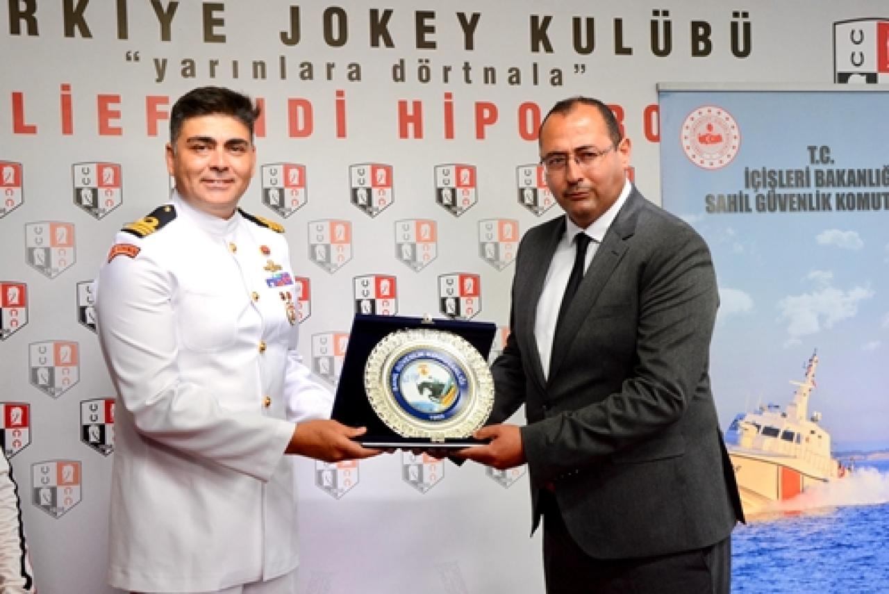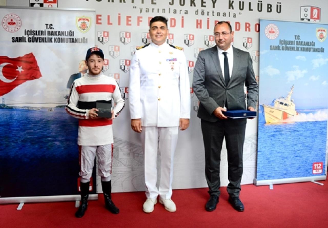 Sahil Güvenlik Kuzey Marmara Grup Komutanı Sg. Binbaşı Ziya Can Gürsoy, kazanan tayın sahibi ve antrenörü adına İstanbul Hipodrom Müdürü Volkan Yıldız’a ve safkanın jokeyi Erhan Aktuğ’a ödüllerini takdim etti.