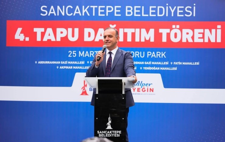 25 Mart Salı günü gerçekleşen tapu töreninde hak sahibi vatandaşlarımıza tapularını dağıtan Sancaktepe Belediye Başkanı Alper Yeğin yaptığı konuşmada göreve geldiği günden bu yana başlayan değişim süreci ile birlikte en büyük hedeflerinden birinin tapu sorunundan arınmış gündeminde tapu problemi olmayan bir Sancaktepe olduğunu altını çizerek "Vatandaşlarımız ile özelikle yaz ayı boyunca gerçekleştirmiş olduğumuz Mahalle günlerinde halkımız tarafından bizlere bildirilen sorunların çözüm noktasında çok gayret sarfettik. Toplam 7 mahalleden 76 ailemizin daha yıllardır süren tapu sorununu devletimizin ilgili kurumları ile birlikte koordine ederek çözdük. Buradan özellikle bu süreçte emeği geçen herkese teşekkür ediyorum. Bizler vatandaşlarımızın sorunlarını çözmek için göreve geldik bugünde bu sorunu çözdüğümüz için çok mutluyum. Görev süremiz boyunca şu ana kadar 256 hak sahibi vatandaşımız tapularını aldılar. Bundan sonraki süreçte ilçemizde bulunan diğer bölgelerde de tapu ve mülkiyet sorununu çözme hususunda çalışmalarımız sürüyor. Amacımız tapu sorunu çözüme kavuşturup gündemimizden çıkarmaktır. Hak sahiplerine tapu dağıtımları önümüzdeki günlerde de devam edecek. Sancaktepe'de tapusuz mülk kalmayacak. Sancaktepe'de ikamet eden her komşumuz kendi tapulu mülklerinde oturmuş olacak" şeklinde konuştu.