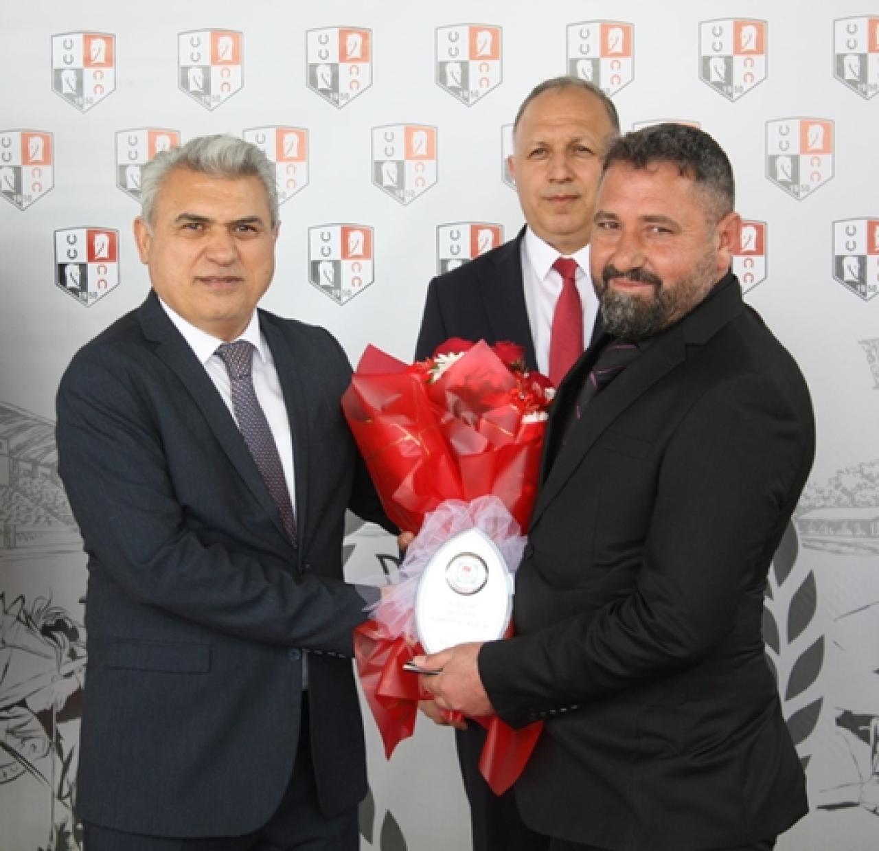 Safkanın aprantisi Mehmet Nuri Sunkar'a plaketini ve çiçeğini ise Sarıçam Belediyesi Gençlik ve Spor Müdürü Kadir Gül verdi.