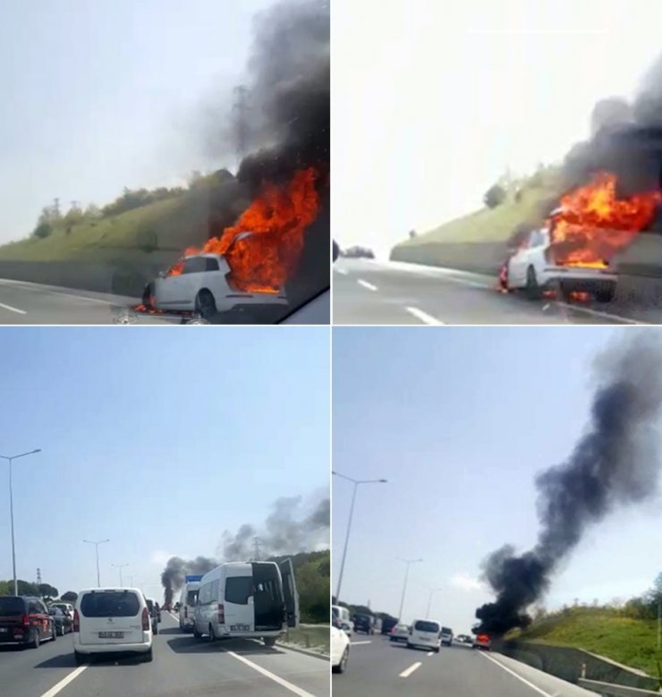 Kemerburgaz'da seyir halinde olan bir araç bilinmeyen bir nedenle alev alev yanmaya başladı. Alev topuna dönen araçtan yükselen dumanlar karayolunu kaplarken, yaşanan o anlar da saniye saniye cep telefonu kamerasına yansıdı.