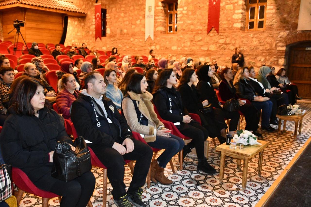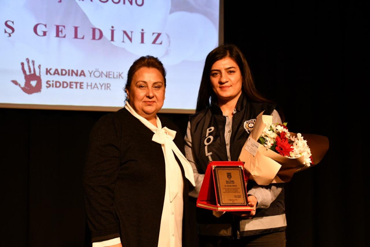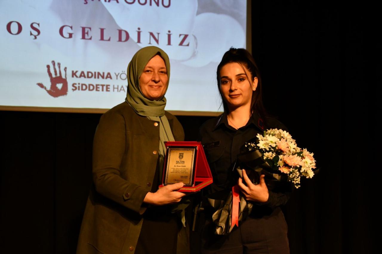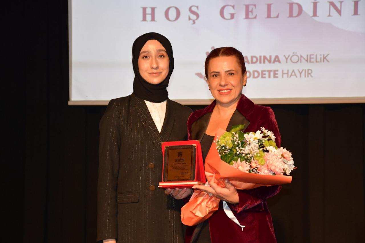 Panelin sonunda Belediye Meclis Üyesi Filiz Güler Aişe Seda Turhan’a, Belediye Meclis üyesi Elif Yılmazer Polis Memuru Hanife Kanaç’a, Belediye Meclis Üyesi Ülkenur Büke Jandarma Astsubay Öznur İlgen’e ve Cumhuriyet Savcısı Esra Uzunoğlu Belediye Meclis Üyesi Avukat Sultan Aşkın’a plaket ve çiçek verdi.