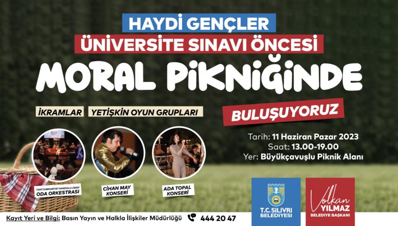 Silivri Belediyesi, 17 Haziran 2023 Cumartesi ve 18 Haziran Pazar günü yapılacak Yükseköğretim Kurumu Sınavı (YKS) öncesi gençler için moral etkinliği düzenliyor. Silivri Belediyesi Kültür Müdürlüğü ile Halkla İlişkiler Müdürlüğü tarafından 11 Haziran 2023 Pazar günü saat 13.00-19.00 arasında Büyükçavuşlu Piknik Alanında gerçekleştirilecek olan moral pikniğinde, ikramlar eşliğinde öğrenciler için çeşitli etkinlikler düzenlenecek. TOKİ Cumhuriyet Anadolu Lisesi Oda Orkestrası konseri, Cihan May konseri ve Ada Topal konseri ile öğrenciler doyasıya eğlenerek sınav stresini üzerinden atıp moral depolamış olacak.