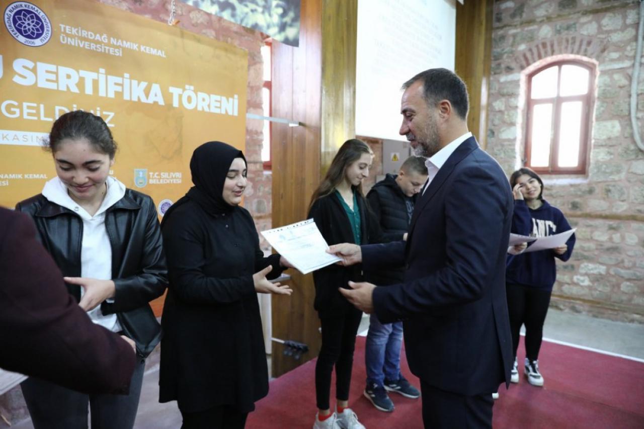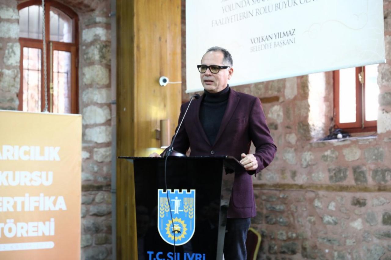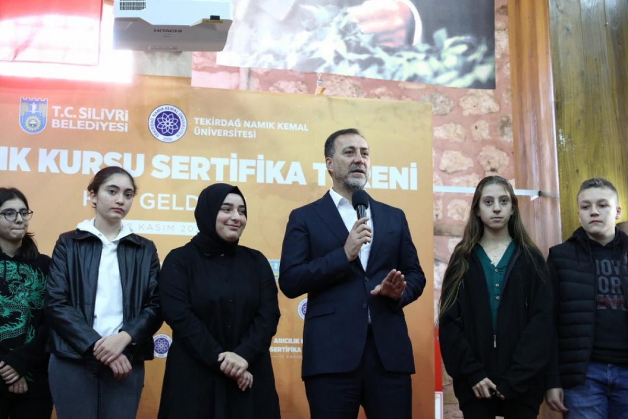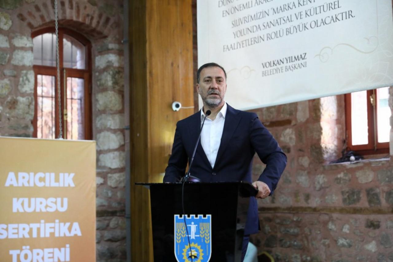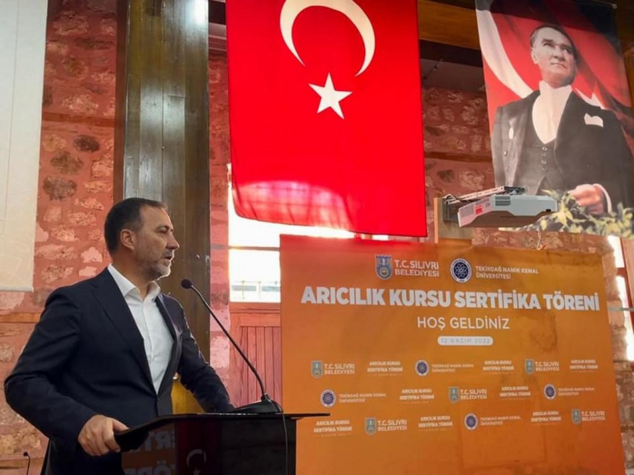 Sertifika dağıtım töreninde konuşan Silivri Belediye Başkanı Volkan Yılmaz, “Silivri Belediyesi olarak, uygulamalı arıcılık kursunun verildiği ender belediyelerden bir tanesiyiz. Ayrıca tarımla ilgili yapmış olduğu yatırımlarla da Türkiye’de kapsamlı çalışmalara imza atan bir belediyeyiz. Türkiye’de Tarım Lisesi olan tek belediyeyiz. Tarımsal Üretim Araştırma Merkezimizde (TÜRAM) üretime dayalı ve yerli, milli Türk tohumlarının yaygınlaştırılması amacıyla çalışmalarımızı sürdürüyoruz. Biz satın alma yaparak tohum ve fide dağıtmıyoruz. Tıpkı Silivri’nin çiftçileri gibi üreterek, alın terimizi, emeğimizi ve yüreğimizi bu topraklara vererek üretiyoruz. Ürettiklerimizi de çiftçilerimizle, hayvancılarımızla ve zirai işlerle uğraşan köylülerimizle paylaşıyoruz. Bu yıl Silivri Belediyesinin ayni olarak yaptığı yardımların ekonomik değeri 25 milyon TL’yi buldu.” ifadelerini kullandı.